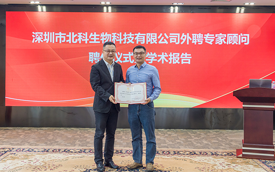 2022年10月18日,深圳市北科生物科技有限公司舉行了外聘專家顧問聘任儀式暨學(xué)術(shù)報(bào)告。北科生物董事長胡雋源博士為中國醫(yī)學(xué)科學(xué)院阜外醫(yī)院心血管疾病國家重點(diǎn)實(shí)驗(yàn)室王志華教授頒發(fā)外聘專家顧問證書。王志華教