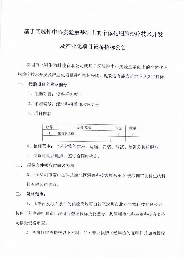 基于區(qū)域性中心實驗室基礎(chǔ)上的個體化細(xì)胞治療技術(shù)開發(fā)及產(chǎn)業(yè)化項目設(shè)備招標(biāo)公告