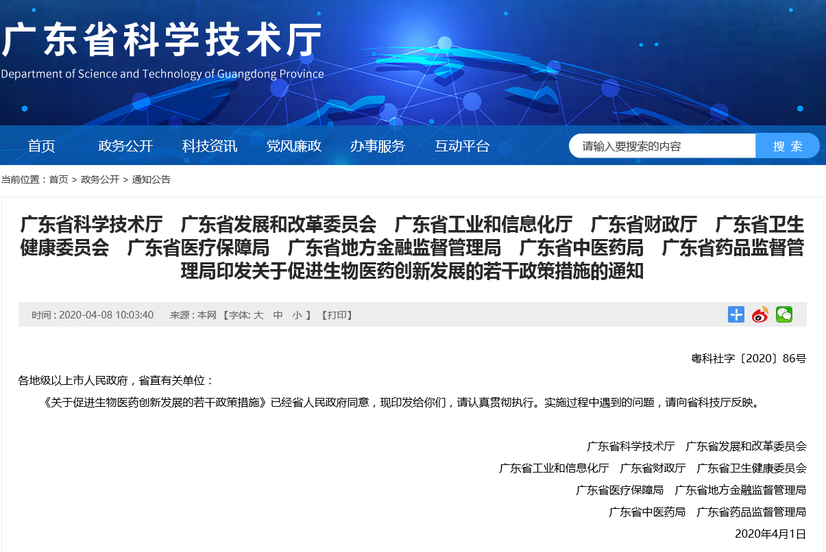2020年4月8日,廣東省科學(xué)技術(shù)廳、廣東省發(fā)展和改革委員會、廣東省工業(yè)和信息化廳、廣東省財政廳、廣東省衛(wèi)生健康委員會、廣東省醫(yī)療保障局、廣東省地方金融監(jiān)督管理局、廣東省中醫(yī)藥局、廣東省藥品監(jiān)督管理局等九部門聯(lián)合印發(fā)《關(guān)于促進生物醫(yī)藥創(chuàng)新發(fā)展的若干政策措施》(以下簡稱《措施》),致力于提升生物醫(yī)藥原始創(chuàng)新能力和國際競爭力,推動生物醫(yī)藥科技和產(chǎn)業(yè)高質(zhì)量發(fā)展,提高生物安全治理能力。