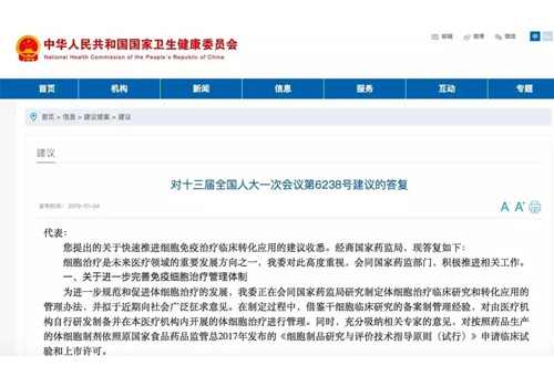 編者按:近日,國家衛(wèi)生健康委員會對十三屆全國人大一次會議第6238號建議給出答復(fù)。答復(fù)稱,國家衛(wèi)健委將會同藥監(jiān)部門,積極推進細(xì)胞治療的相關(guān)工作。答復(fù)中還提到,“近期10余個細(xì)胞治療產(chǎn)品即將獲批開展臨床試驗。”全文如下: