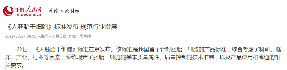 人民網(wǎng)報道:《人胚胎干細胞》標準發(fā)布 規(guī)范行業(yè)發(fā)展